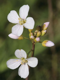 | The cuckooflower (cardamine pratensis) appears in April in the boggy parts of the meadow. They show some color variation, from white to pale pink or lilac. They are distinctive for having four petals ( surprisingly there aren't that many flowers with four petals ! ). |